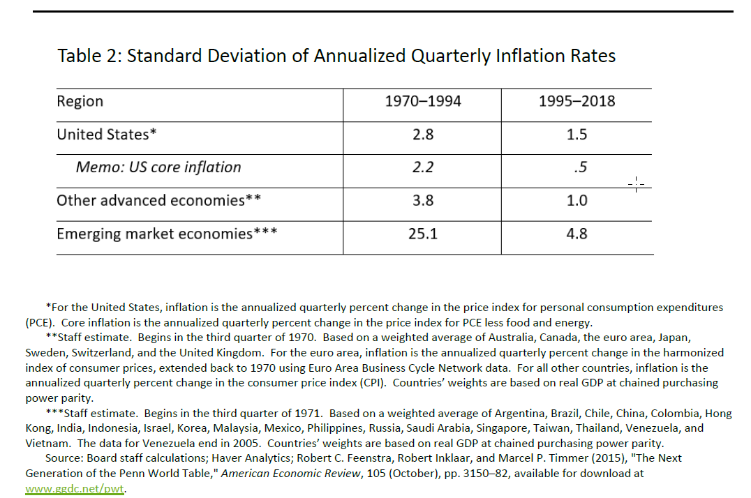However, not only has the average level of inflation fallen, but inflation has also become more stable. After considerable volatility in the 1970s and 1980s, over the past few decades, inflation—especially core inflation, which excludes volatile food and energy prices—has, with rare exceptions, moved only within a relatively narrow range in many countries despite significant swings in the prices of oil and other commodities, recessions, the Global Financial Crisis, and unprecedented monetary policy actions. Reflecting this, inflation volatility, as measured by the standard deviation in quarterly inflation rates, has declined. (See table 2, "Standard Deviation of Annualized Quarterly Headline Inflation Rates.")