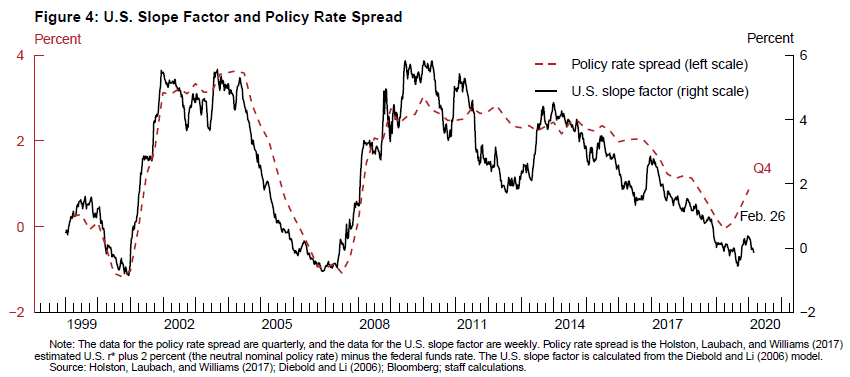 I would now like to illustrate what I mean when I say that the slope of the yield curve is an important channel through which monetary policy is transmitted. Figure 4 plots the Diebold-Li (DL) slope factor for the United States—which is included in figure 1—against the spread between the HLW estimate of the U.S. neutral nominal policy rate and the actual federal funds rate (hereafter the "policy rate spread"). As is evident from figure 4, most of the variation in the DL slope factor for the Treasury yield curve can be accounted for by changes in the U.S. policy rate spread.7 A simple regression over the 1999:Q1 to 2019:Q4 sample of the slope factor on the policy rate spread shown in figure 4 yields an R2 of 0.84 with a coefficient on the policy rate spread of 1.23. In other words, over the past 20 years, more than three-fourths of the variance of the Treasury slope factor can be accounted for by the policy rate spread, which is obviously something the Federal Reserve can control when it sets the federal funds rate. The remaining variance of the benchmark Treasury slope factor is, by construction, accounted for by factors that are uncorrelated with the U.S. policy rate spread. A similar empirical relationship between the policy rate spread and the slope factor embedded in gilt and bund yield curves is also evident in the data, although there is some evidence in these markets of a structural break in these relationships between the slope factor and the policy rate spread sometime after the Global Financial Crisis.8 In the interest of time, I shall not put forward a theory of what accounts for the residual variance of yield curve slope factors after accounting for the policy rate spread itself, but obvious candidates (certainly at the ELB) would include forward guidance about the path of the future policy rate as well as actual and prospective large-scale asset purchase (LSAP) programs.
