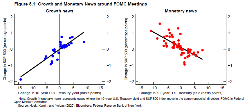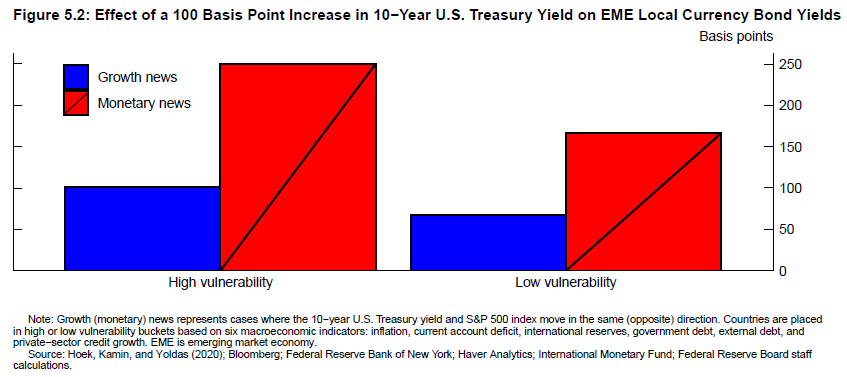 It is a truism that "correlation is not causation," and this is especially the case when trying to interpret contemporaneous correlation among asset prices generally and among bond yields in particular. Having identified one possible, parsimonious set of economic fundamentals that can help account for yield curve fluctuations in three major sovereign markets, I will now review what the empirical evidence has to say about the direction of causality reflected in observed correlations among sovereign yields.9 I will explore two possibilities. The first possibility is that, in reality, there are no latent "global" factors whatsoever, but rather there are just U.S. factors that exogenously fluctuate and cause the global correlations in bond yields we observe in the data. There is a vast literature (Claessens, Stracca, and Warnock, 2016, provide an overview) that documents the existence of spillovers from U.S. monetary policy, especially to emerging market (EM) financial conditions, although the recent paper by Hoek, Kamin, and Yoldas (2020) suggests that the degree of those spillovers depends importantly on the source of the shock that triggers changes in Federal Open Market Committee (FOMC) policy. In particular, as summarized in figure 5.1, they identified FOMC actions associated with "growth news" as those that were immediately followed by changes in the 10-year Treasury yield and the S&P 500 index in the same direction, whereas actions associated with "monetary news" elicited changes in yields and equity prices in opposite directions. Their key finding, illustrated in figure 5.2, was that FOMC policy rate surprises attributed to stronger U.S. growth generally have only moderate spillovers to EM financial conditions, whereas FOMC policy rate surprises attributed to U.S. inflationary pressures trigger more substantial spillovers to EM financial conditions. Regardless of the type of FOMC policy action, Hoek, Kamin, and Yoldas (2020) also found compelling evidence that the size of the spillover effects from the United States depends importantly on the degree of macroeconomic vulnerability of each emerging market economy (EME), with more vulnerable EMEs experiencing larger spillovers.