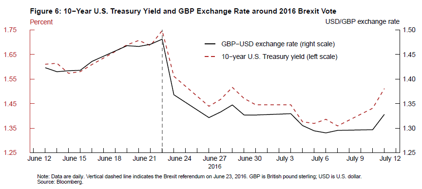 11. Also note from figure 6 that in the weeks before and after the Brexit vote, the 10-year Treasury yield and the dollar–pound exchange rate were rising and falling together as the market assessed the likelihood of a Brexit vote (before) and the implications of a Brexit vote (after). Return to text