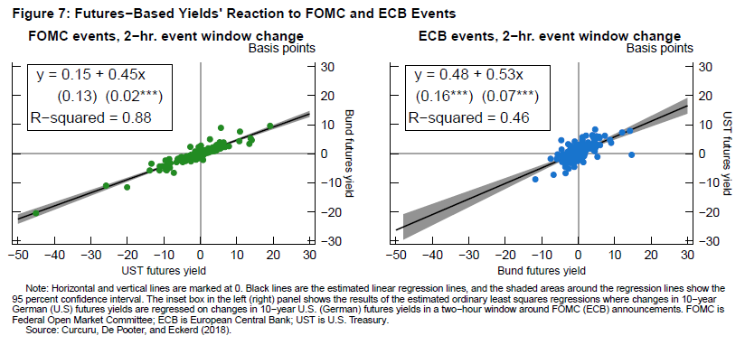 Curcuru, Stephanie E., Michiel De Pooter, and George Eckerd (2018). "Measuring Monetary Policy Spillovers between U.S. and German Bond Yields," International Finance Discussion Papers 1226. Washington: Board of Governors of the Federal Reserve System, April.