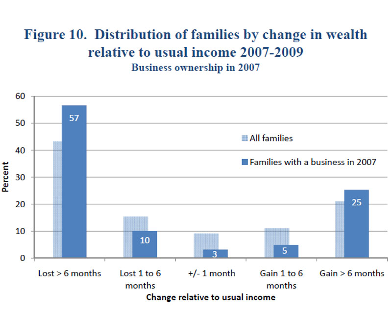 The spread of gains and losses from 2007 to 2009 was sharper for business owners than for the population overall (figure 10). Fifty-seven percent of business owners saw substantial losses in their net worth relative to their usual income, compared with 43 percent of the overall population; but the percentage of business owners who saw large wealth gains relative to their income was also larger than for the overall population.