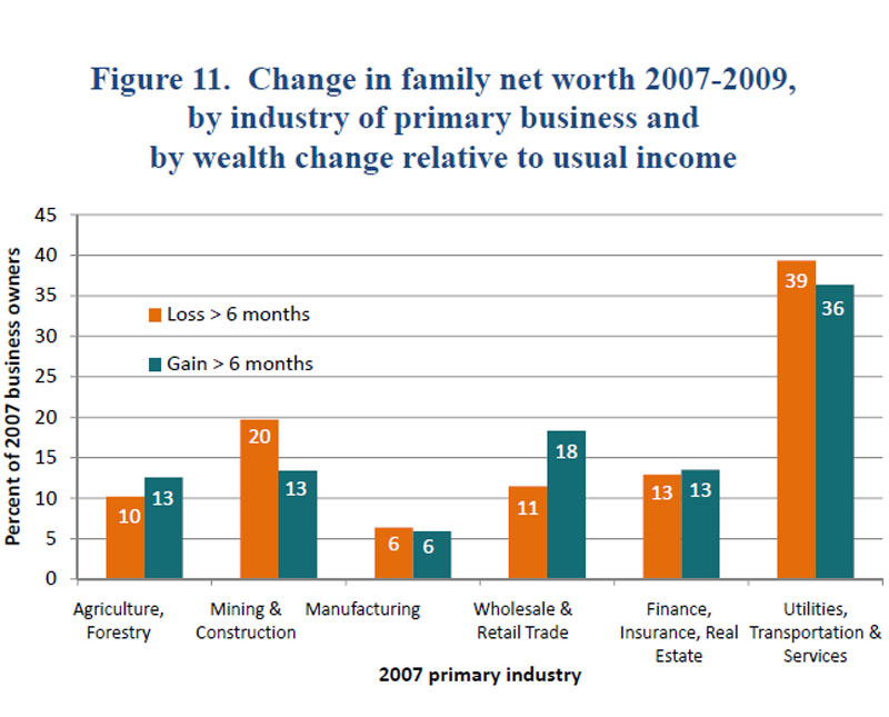 The industry in which the business operated had a significant impact on whether the business owner gained or lost wealth. Families with businesses primarily engaged in mining or construction--among small businesses in the survey, this was overwhelmingly construction-related businesses--were the most likely to see a substantial decline in net worth (figure 11). In contrast, families with a wholesale or retail business were more likely to see a substantial gain. Those involved in utilities, transportation, and services--in the survey, this was predominantly services--saw the largest gains and the largest losses, but losses exceeded gains for the group.