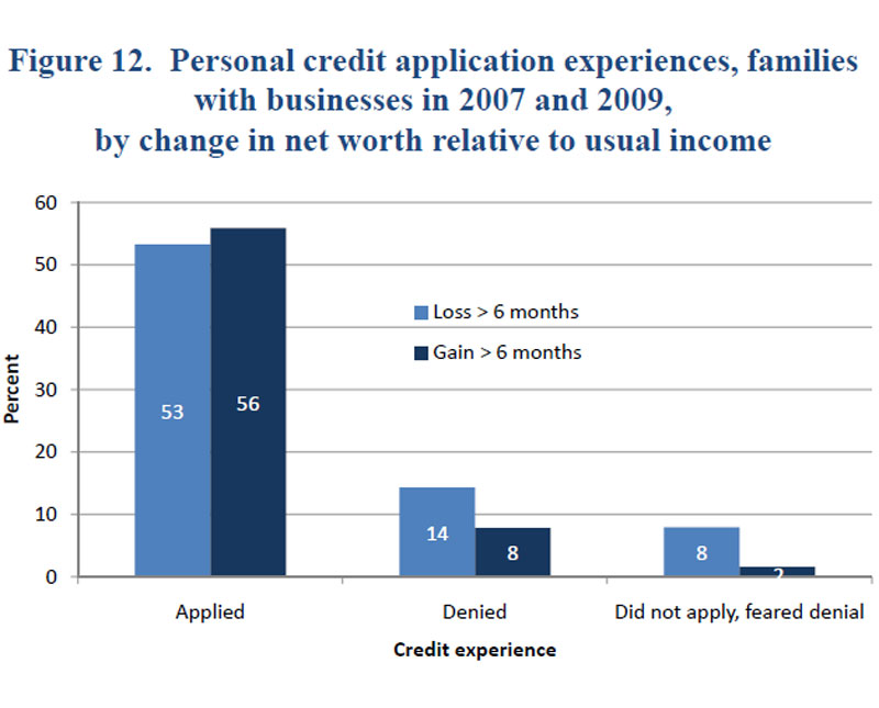 The 2009 SCF panel interview asked participants to report separately whether they had applied for personal and business loans during the two-year period. If they had, it asked whether they had been turned down for a loan. The survey also asked whether they had wanted to borrow for personal or business purposes but had been so convinced they would be turned down that they did not apply.
