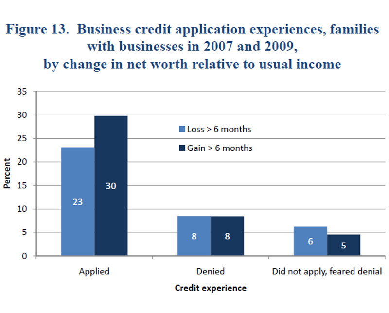 The data show a substantial level of personal and business applications both for owners whose wealth rose and for those whose wealth fell over the period of the SCF panel. The level of personal applications was slightly higher for those whose wealth increased over the period, and their applications were more likely to have been approved (or they were less likely to have believed they would have been denied) (figure 12).