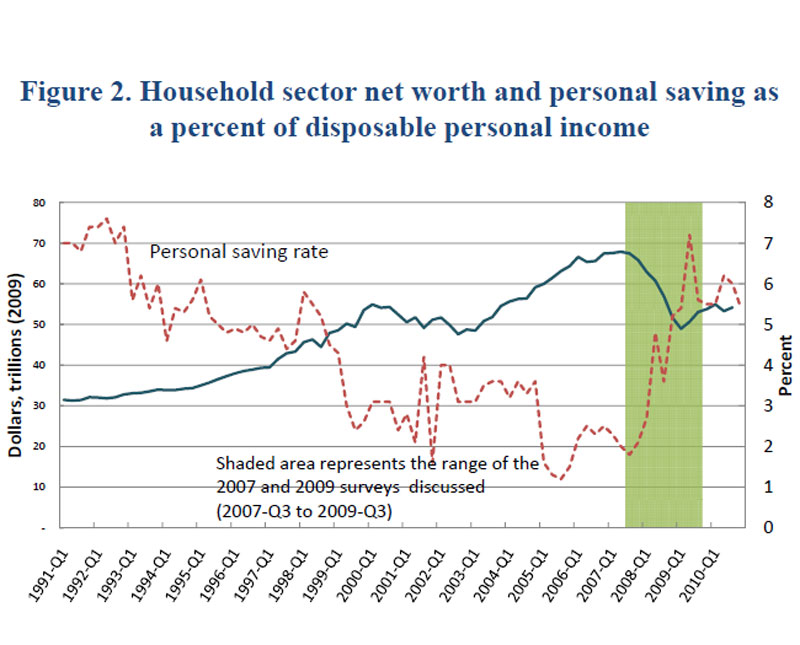 The personal saving rate, which had been trending downward before the recession, jumped during the crisis as spending retreated (figure 2). Traditional macroeconomic analysis would attribute at least some of the increase in the saving rate and corresponding drag in the recovery of consumer spending to diminished household wealth. That direct effect might be compounded if the wealth decline also affected consumers' confidence and expectations, which could affect families' future decisions. For example, workers on the cusp of retirement might need to work longer than they had planned and business owners might be unable or unwilling to leverage their personal assets to fund or expand their businesses. In addition, if attitudes toward risk have shifted, households might make different decisions about spending, or about saving, than they have in the past.