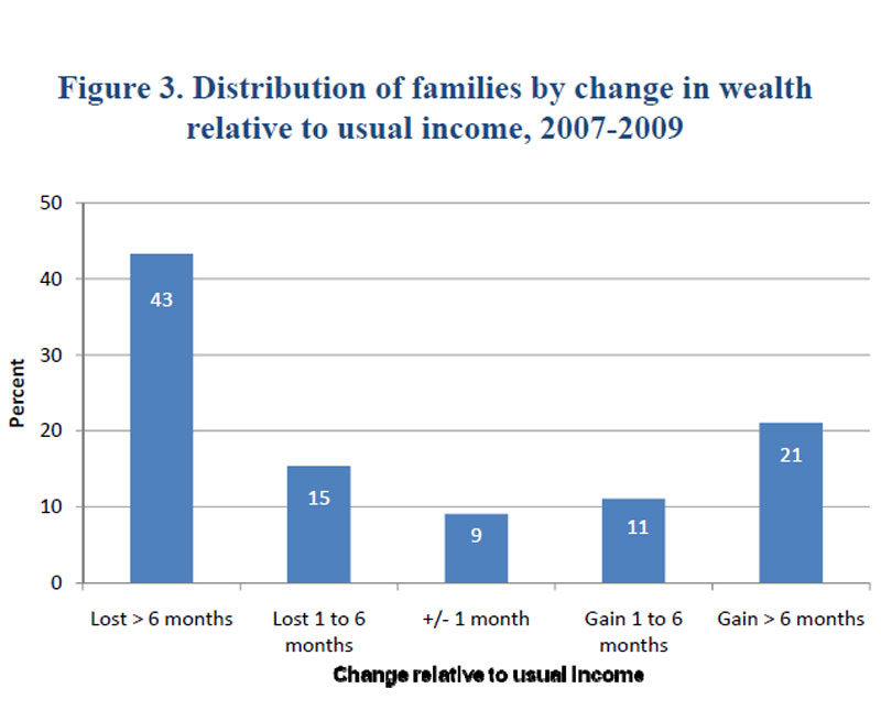 In the SCF, we include a measure of the level of income that families consider their usual income.2 Taking this measure as a scaling device for wealth changes, we see that 43 percent of families saw a wealth decline equal to or more than six months of their usual income (figure 3). Almost a third saw a loss greater than an entire year of their usual income (not shown). However, more than a fifth of families saw a gain in wealth that was greater than six months of their usual income.