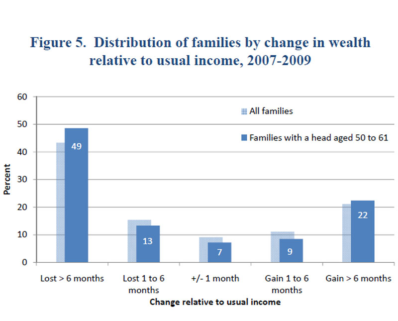 As was the case for families overall, experiences varied widely. The share of families in the 50-to-61 age group that saw a substantial increase in their net worth--more than six months of their usual income--was nearly the same as for families overall (figure 5). But 49 percent of the age group saw a decline of more than six months of their usual income, compared with 42 percent of families overall.