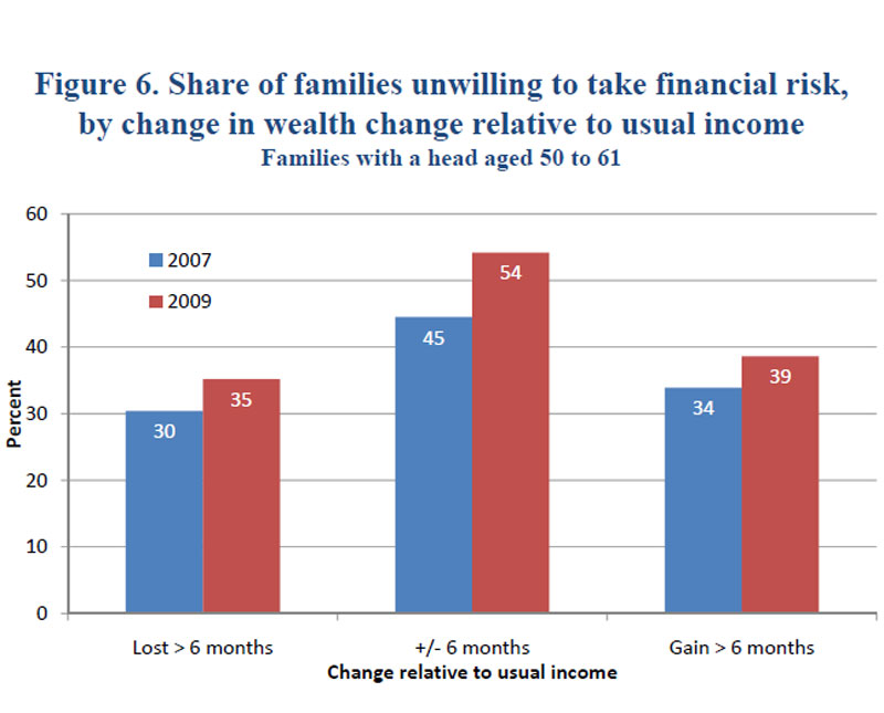 Boomer families' reported willingness to take on financial risk also changed over the panel period. Regardless of the change in their wealth, these families were more likely to report being more unwilling to take financial risk in 2009 than in 2007 (figure 6).
