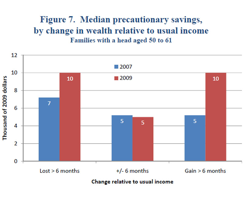 This sense of increased caution is reinforced by the answers to questions the survey posed to families about the amount of money they think they need to cope with emergencies and other unexpected events. The median value of this measure of desired precautionary savings increased substantially from 2007 to 2009 for the preretirement groups that experienced large changes in wealth, regardless of whether the change was a gain or a loss, and was virtually unchanged for others (figure 7). Furthermore, the largest percentage increase was for families that experienced wealth gains.