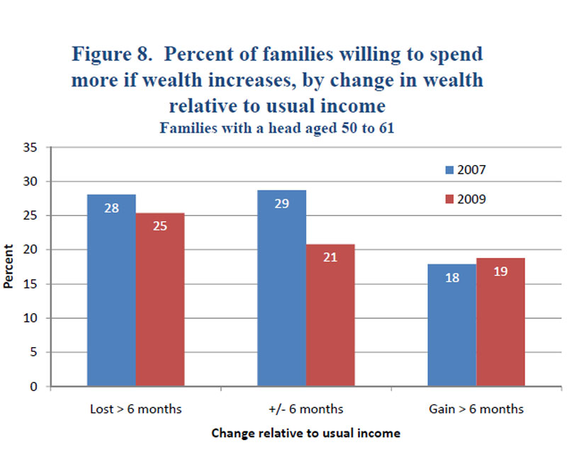 In the boom years leading up to the crisis, many economists believed that increases in wealth, especially increases in home equity, helped fuel consumer spending. However, fewer than 30 percent of boomer families reported in 2007 that they would be willing to spend out of any increase in asset values. In 2009, that willingness declined for boomer families that experienced losses as well as for boomer families that experienced only small gains. Somewhat counterintuitively, boomer families that experienced significant gains in their net worth from 2007 to 2009--gains greater than the equivalent of six months of income--also remained largely unwilling to spend out of increases in asset values. In fact, they were among the least willing in 2007 and they remained among the least willing two years later. Thus, boomer families remained cautious, or grew more cautious, about spending out of their asset gains--regardless of whether they experienced significant losses during the crisis (figure 8).