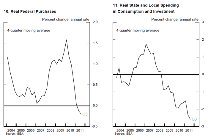 The government sector also continues to be a substantial drag on activity, both at the federal level (chart 10)--where defense and nondefense spending look to have dropped last year--and at the state and local levels (chart 11). The declines in state and local government expenditures reflect continuing cutbacks in both employment and construction outlays. The budgets of these governments are quite strained by the ongoing phase-out of federal stimulus grants and the weakness of local tax collections.
