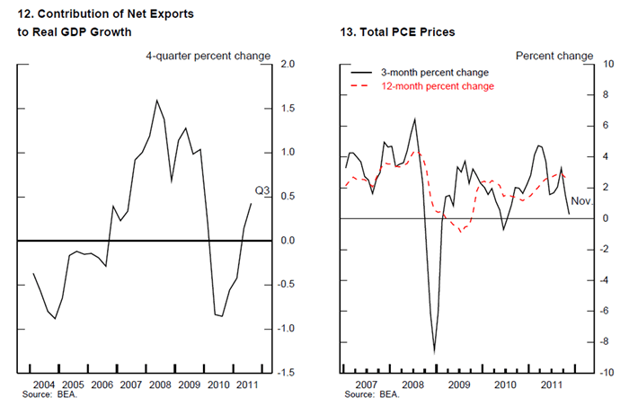One area of the economy that has been performing relatively favorably is the trade sector. In the third quarter, the annualized growth rate of exports of domestically produced goods and services was about 5 percent, while net exports--that is, exports less imports--contributed nearly one half of a percentage point to the increase in real GDP, about one-fourth of the overall gain (chart 12). However, in recent weeks, many forecasters have weakened their global outlooks substantially, which certainly does not bode well for U.S. exports going forward.