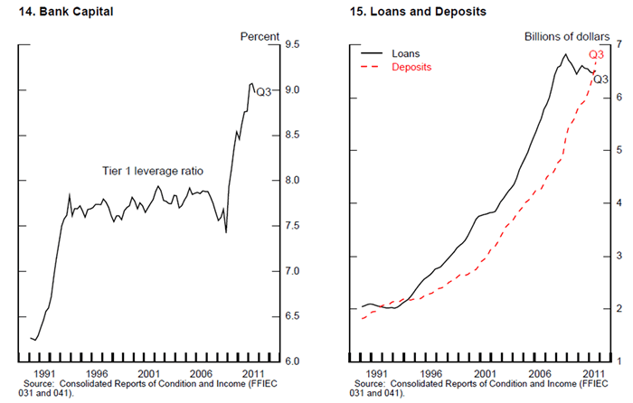 However, I do believe that the headwinds from tight credit conditions for businesses and households, with the exception of mortgage credit, are beginning to subside. Financial institutions in the United States have stronger capital positions than they did in 2008, and the Federal Reserve continues to regularly test the ability of the largest institutions to withstand economic stress (chart 14). Bank deposits have grown substantially, thereby allowing many banks to reduce their dependence on more volatile wholesale funding (chart 15). And, although loan balances have increased in recent months, they remain well below their peak levels, leaving banks with substantial liquidity. Measures of credit stress such as reductions in nonperforming assets, delinquencies, and charge-off rates show steady improvement in credit quality.