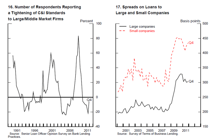 As a result, most banks are now actively seeking loan growth to improve their profitability. In fact, competition for loans, along with an improving outlook for the economy, has caused lenders to ease their standards from the stringent ones applied during the recession. In the area of business lending, the Federal Reserve's latest Senior Loan Officer Opinion Survey on Bank Lending Practices (SLOOS) (chart 16) and the Survey of Terms of Business Lending (chart 17) indicate improving conditions for corporate borrowers.1 To a lesser extent, but still showing some easing, are standards for small business and commercial real estate loans.