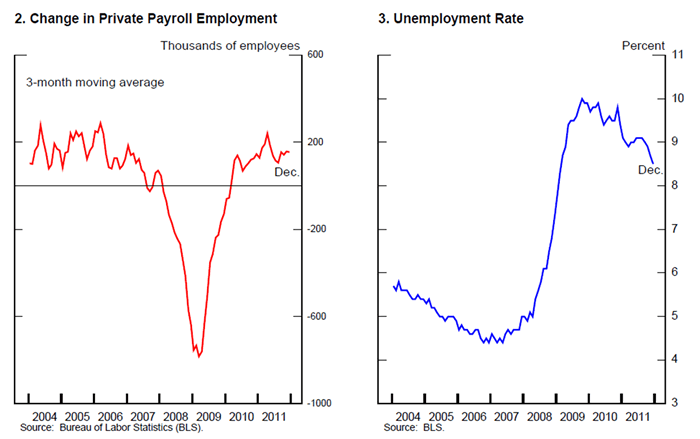Perhaps the most telling measure of the subpar pace of recovery is the painfully slow improvement in the labor market. Employment gains were tepid last year and made only a small dent in the large number of people who are still out of work (chart 2). In recent months, there have been glimmers of hope seen in the job market. For example, payroll employment rose 200,000 in December and the unemployment rate, which had hovered around 9 percent for most of the year, fell to 8.5 percent, a rate that while still far too high was the lowest in 2-1/2 years (chart 3). That said, other economic data have improved more modestly, and the bulk of the evidence, including help-wanted advertising and surveys of employers' hiring plans, suggests that the job market is not poised for marked improvement in the months ahead. Indeed, my own expectation is that while the trend in unemployment will be gradually lower, the path to get there might be choppy.