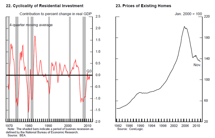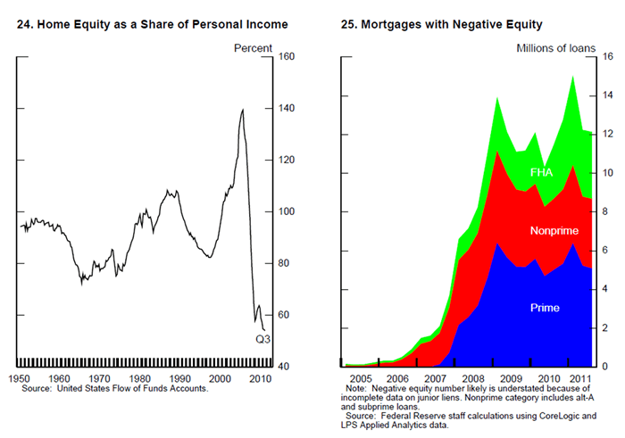 Thus far, however, the housing sector has not contributed to the recovery. In addition to the lack of any meaningful improvement in residential construction, the expansion has also been hindered by the steep descent of house prices. To date, house prices have fallen by nearly one-third from their peak (chart 23), pushing home equity as a share of personal income to its lowest level on record (chart 24) and wiping out $7 trillion of housing equity. Further, this decline in housing wealth--and the associated hit to consumer confidence--has not only been a meaningful and persistent drag on overall consumer spending, it has also been enough to push nearly 12 million homeowners underwater on their mortgages, that is their houses are now worth less than their mortgage balances (chart 25). Without equity in their homes, many households who have suffered hardships such as unemployment or unexpected illness have been unable to resolve mortgage payment problems through refinancing their mortgages or selling their homes. The resulting mortgage delinquencies have ended in all too many cases in foreclosure, dislocation, and personal hardship. Neighborhoods and communities have also suffered profoundly from the onslaught of foreclosures, as the neglect and deterioration that frequently accompany vacant properties makes neighborhoods less desirable places to live and may put further downward pressure on house prices.2