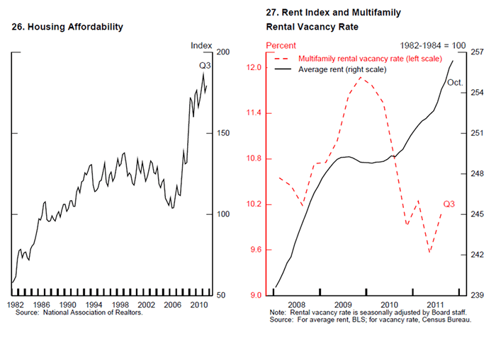 The problems that led to the mortgage crisis and the potential policy solutions to those problems are numerous and varied. Even though time does not permit a full discussion of them here, I do believe that forceful and effective housing policies have the potential to significantly influence the speed and strength of our economic recovery. The Federal Reserve has already acted to reduce mortgage rates by purchasing longer-term assets, in particular through the purchase of agency mortgage-backed securities. Indeed, low rates combined with falling house prices have contributed to historically high levels of housing affordability (chart 26). At the same time, rents have been rising, which should make homeownership a more attractive option relative to rental housing (chart 27).