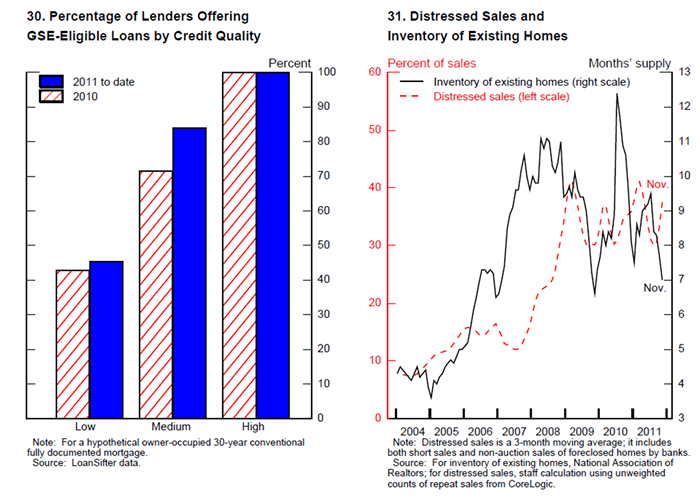 Finally, many households are unable to purchase homes because of mortgage credit conditions, which are substantially tighter now than they were prior to the recession. Some of this tightening is appropriate, as mortgage lending standards were lax, at best, in the years before the peak in house prices. However, the extraordinarily tight standards that currently prevail reflect, in part, new obstacles that inhibit lending even to creditworthy borrowers. These tight standards can take many forms, including stricter underwriting, higher fees and interest rates, more stringent documentation requirements, larger required down payments, stricter appraisal standards, and fewer available mortgage products. This tightening in mortgage credit can be seen in the increase in the credit scores associated with newly originated prime and Federal Housing Administration (FHA) mortgage originations (charts 28 and 29), which suggests that borrowers who likely had access to mortgage credit a few years ago are now essentially excluded from the mortgage market.