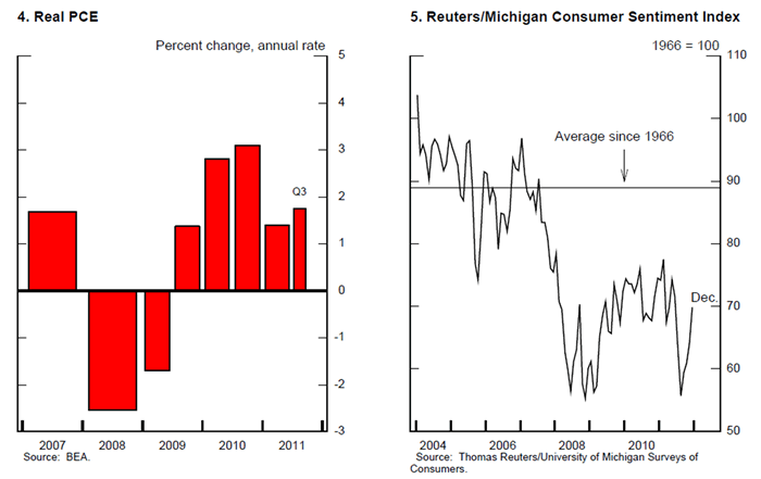 On a brighter note, consumer spending looked a bit stronger in the latter part of last year after an anemic first half (chart 4). The pickup in consumer spending was fairly widespread through November and, although we don't yet have a full set of December data in hand, sales of motor vehicles remained solid at an annual rate of 13.5 million units last month, and reports of holiday spending were upbeat. That said, there are some reasons not to get too optimistic about this sector of the economy: Many of the underlying forces that typically support consumer spending are still quite weak, including the high unemployment rate, sluggish income growth, sentiment that remains relatively low despite recent improvements (chart 5), and the lingering effects of the earlier declines in household wealth.