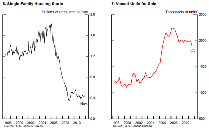 Housing markets--which I will discuss in more detail shortly--have shown only slight signs of improvement: Housing demand and homebuilding (chart 6) continue to be restrained by weak income and sentiment, tight lending standards, and a large overhang of vacant properties (chart 7).