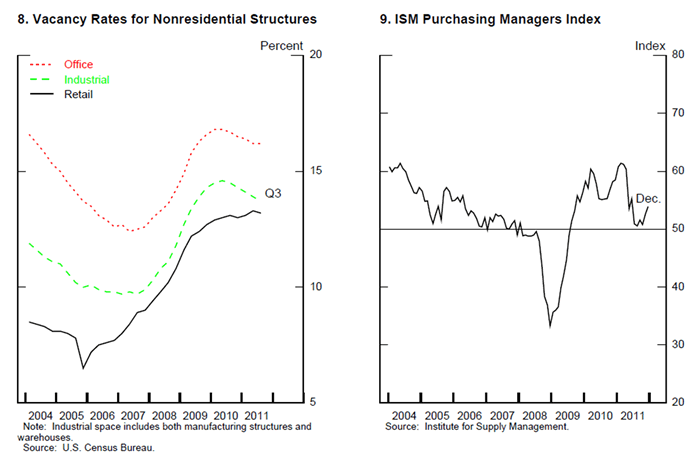 As for the business sector, the uncertain durability of the recovery appears to be discouraging businesses from decisively increasing their productive capacity. Notwithstanding a surge around mid-2011, on balance, firms appear to have increased their spending on equipment and structures at a less robust pace in 2011 than they did in the prior year. The pace of inventory accumulation was also quite modest. The most recent indicators suggest more of the same: Orders and shipments of capital goods have been subdued in the past few months, commercial vacancy rates remain elevated (chart 8), and most indicators of business sentiment remain mediocre (chart 9).