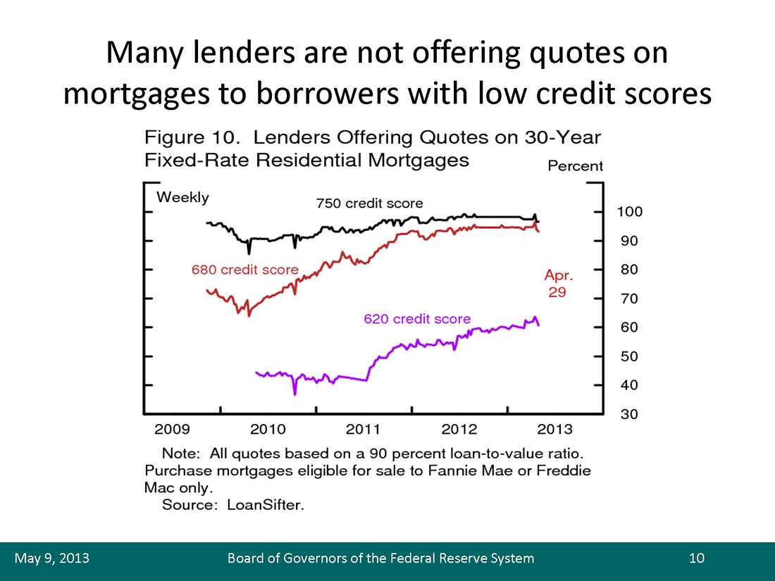 To summarize, the housing market is improving, but mortgage credit conditions remain quite tight for borrowers with lower credit scores. And the path to easier credit conditions is somewhat murky. Some of the forces damping mortgage credit availability, such as capacity constraints and concerns about economic conditions or house prices, are likely to unwind through normal cyclical forces. However, resolution of lender concerns about putback risk or servicing cost seems less clear. These concerns could be reduced by policy changes. For example, the structure of liability for representations and warrantees could be modified. Or servicing compensation could be changed to provide higher compensation for the servicing of delinquent loans. Or lenders might find ways to reduce their exposure to putback risk or servicing cost by strengthening origination and servicing platforms. New mortgage regulations will provide important protections to borrowers but may also lead to a permanent increase in the cost of originating loans to borrowers with lower credit scores. It will be difficult to determine the ultimate effect of the regulatory changes until they have all been finally defined and lenders gain familiarity with them.