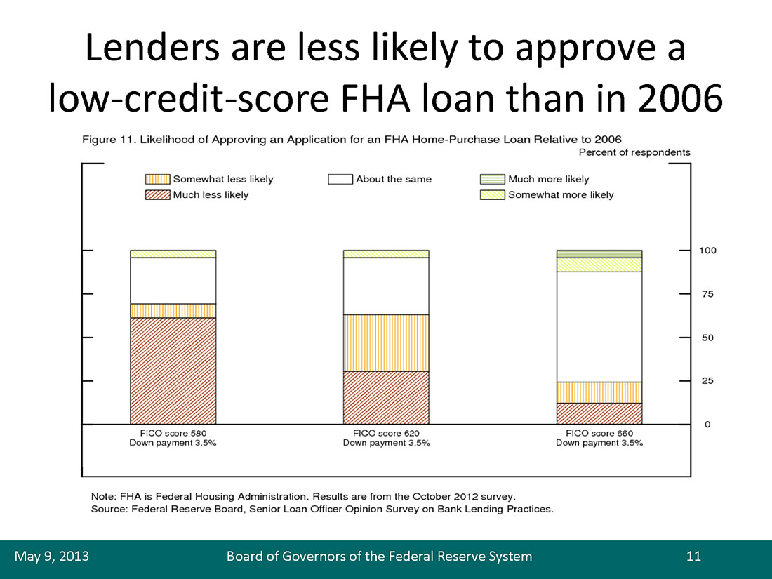 Tight credit conditions also appear to be part of the story for FHA-insured loans. In the Federal Reserve's October 2012 Senior Loan Officer Opinion Survey on Bank Lending Practices (SLOOS), one-half to two-thirds of respondents indicated that they were less likely than in 2006 to originate an FHA loan to a borrower with a credit score of 580 or 620 (figure 11). Standards have tightened a bit further since: In the April 2013 SLOOS, about 30 percent of lenders reported that they were less likely than a year ago to originate FHA mortgages to borrowers with a credit score of 580 or 620 (figure 12).10