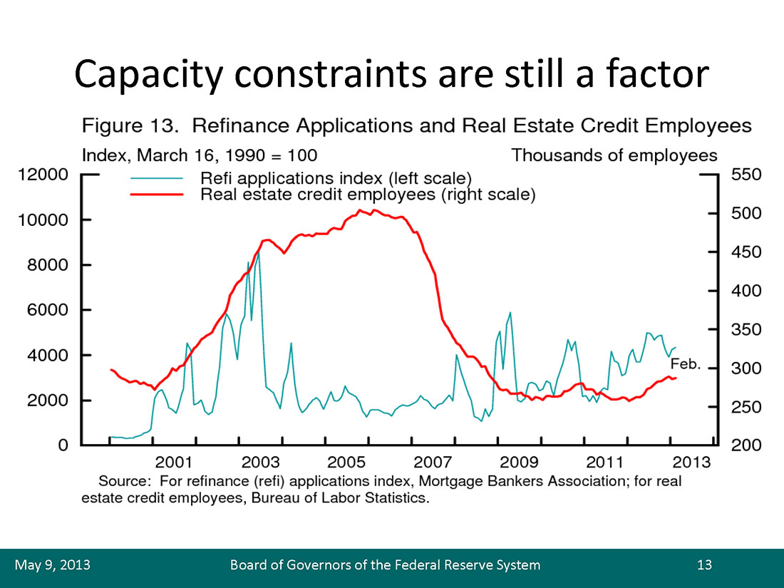 11. These estimates are smaller than the estimates in the March 2013 Mortgage Bankers Association speech because capacity constraints appear to have become less severe in recent months (see Duke, "Comments on Housing and Mortgage Markets," in note 1). These estimates are for the period from February 2011 to February 2013. The March estimates were for the period from October 2010 to October 2012. Return to text