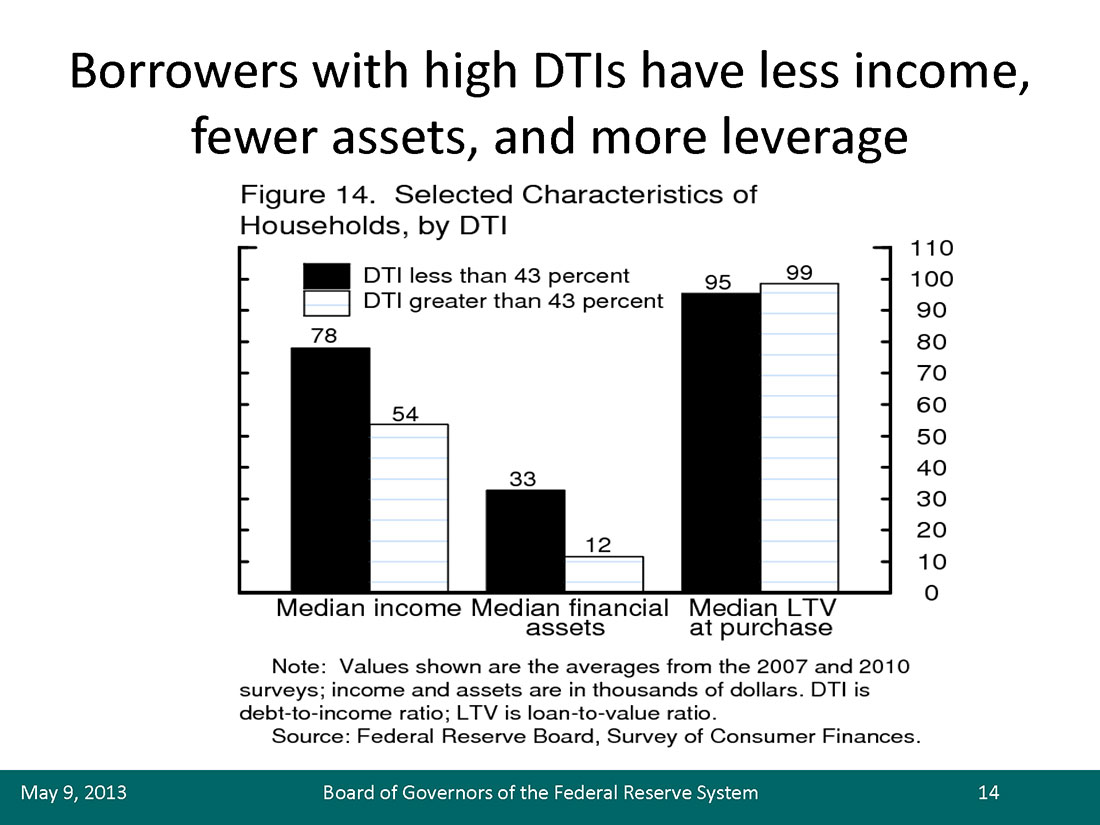18. The tabulation is based on households that purchased a home with mortgage credit in the two years preceding the Board's Survey of Consumer Finances for 2001, 2004, 2007, and 2010. About 15 percent of borrowers in the 2001, 2004, and 2010 surveys and 25 percent in the 2007 survey had DTIs greater than 43 percent. The 2007 statistic was reported incorrectly in the March 2013 Mortgage Bankers Association speech (see Duke, "Comments on Housing and Mortgage Markets," in note 1). DTI is measured at the time of the survey, not at the time of the loan origination, and may understate the number of affected households if household finances improve after the purchase of a home. Return to text