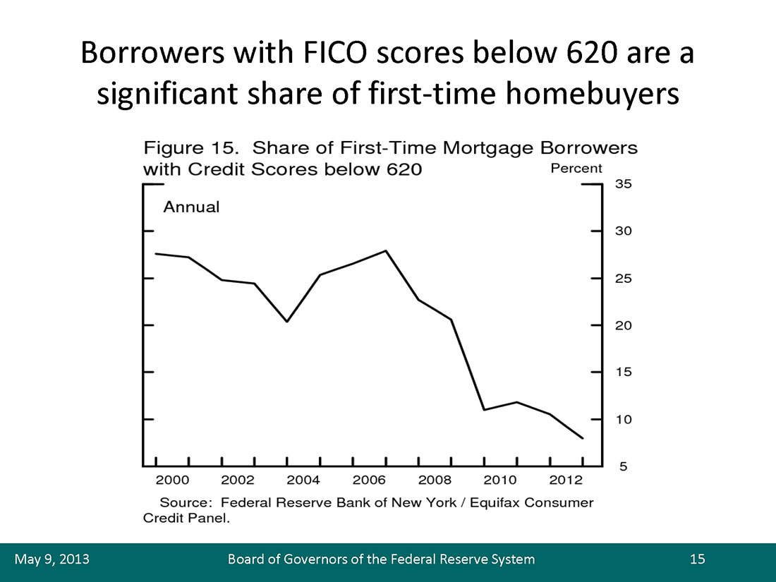 The implications for the housing market are also murky. Borrowers with lower credit scores have typically represented a significant segment of first-time homebuyers. For example, in 1999, more than 25 percent of first-time homebuyers had credit scores below 620 compared with fewer than 10 percent in 2012 (figure 15).20 Although I expect housing demand to expand along with the economic recovery, if credit is hard to get, much of that demand may be channeled into rental, rather than owner-occupied, housing.