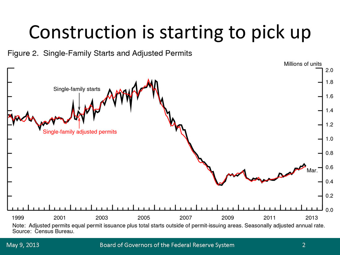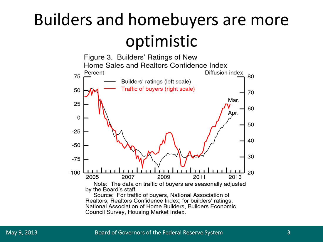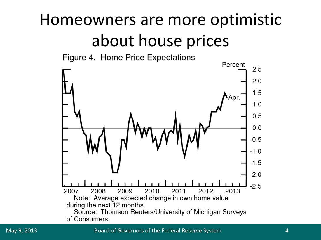 A sustained recovery in the housing market appears to be under way. House prices, as measured by a variety of national indexes, have risen 6 to 11 percent since the beginning of 2012 (figure 1).2 The recovery of house prices has been broad based geographically, with 90 percent of local markets having experienced price gains over the year ending in February. Also since the beginning of 2012, housing starts and permits have risen by nearly 30 percent (figure 2), while new and existing home sales have also seen double-digit growth rates. Homebuilder sentiment has improved notably, and real estate agents report stronger traffic of people shopping for homes (figure 3).3 In national surveys, households report that low interest rates and house prices make it a good time to buy a home; they also appear more certain that house price gains will continue (figure 4).4