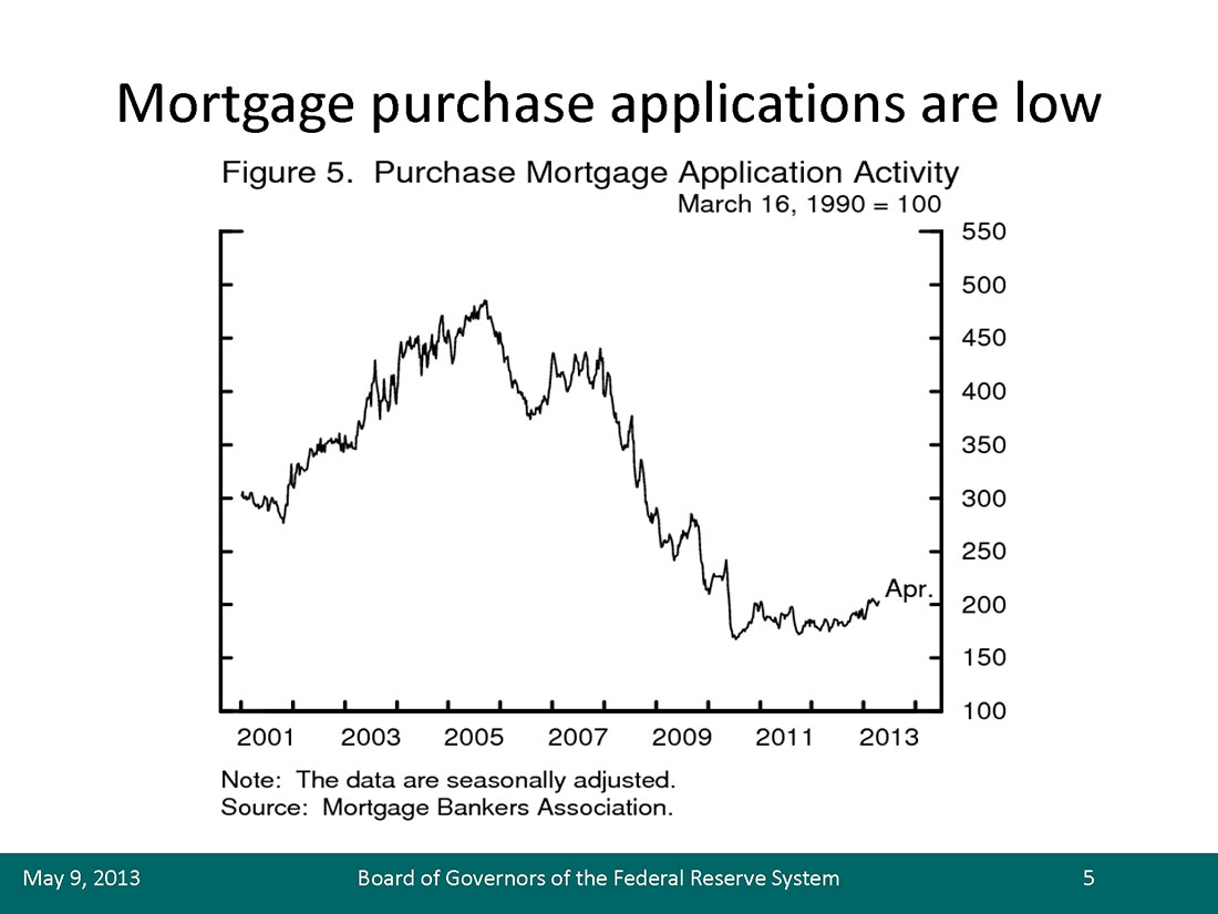 Despite the recent gains, the level of housing market activity remains low. Existing home sales are currently at levels in line with those seen in the late 1990s, while single-family starts and permits are at levels commensurate with the early 1990s. And applications for home-purchase mortgages, as measured by the Mortgage Bankers Association index, were at a level in line with that of the mid-1990s (figure 5). The subdued level of mortgage purchase originations is particularly striking given the record low mortgage rates that have prevailed in recent years.