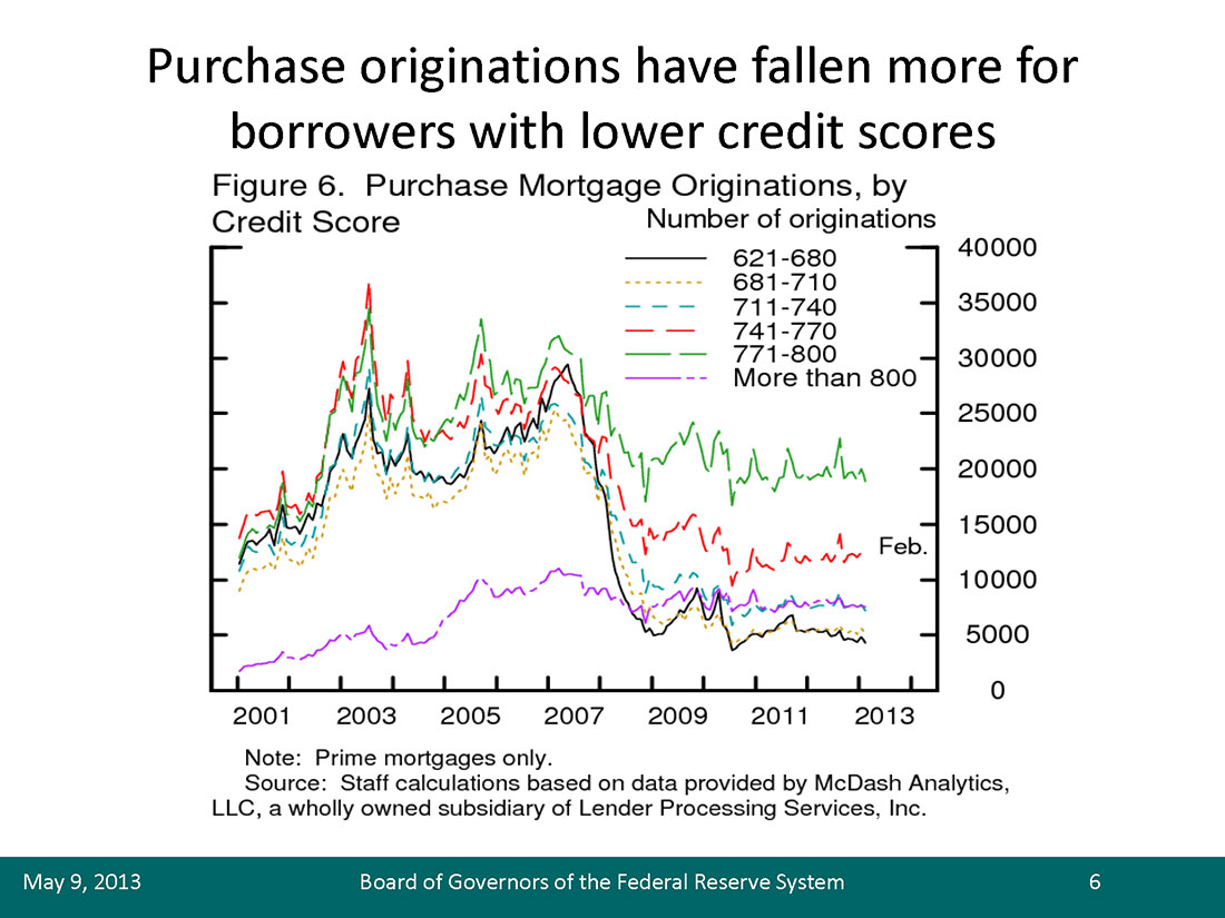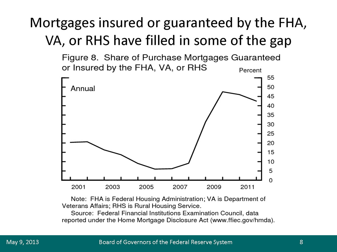 6. Staff calculations suggest that the FHA and VA market share dipped a bit in 2012 but remained quite elevated. These calculations are based on data provided by McDash Analytics, LLC, a wholly owned subsidiary of Lender Processing Services, Inc. Return to text