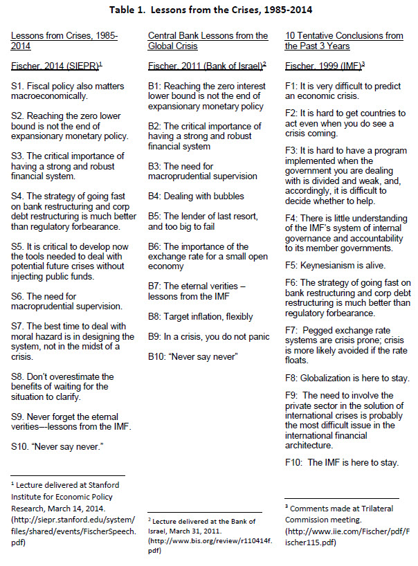 The ten lessons presented in each paper are summarized in Table 1. Each lesson is numbered, and each bears a letter: F for the 1999 paper (written when I was at the IMF); B for the 2011 paper, when I was at the Bank of Israel; and S for SIEPR2 , where the 2014 paper was presented.