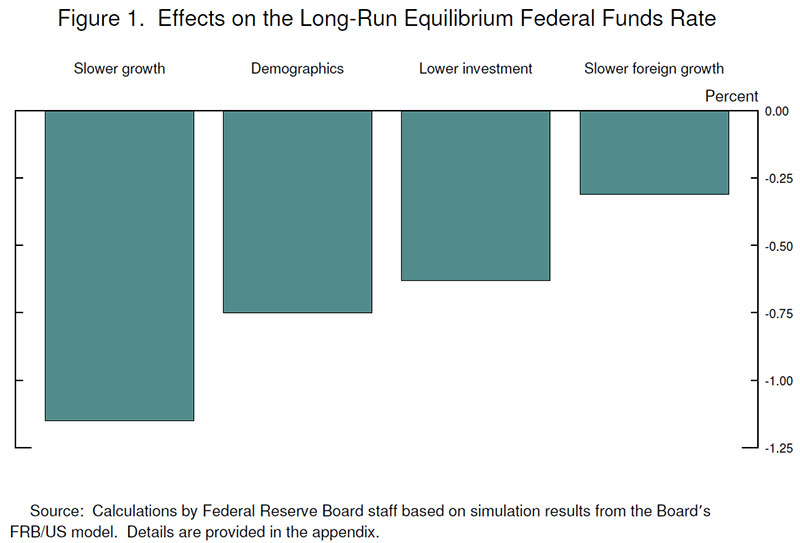 Demographics. As explained in the text, the effect of demographics on the equilibrium federal funds rate is based on the study of Gagnon, Johannsen, and Lopez-Salido (2016), who emphasize that demographic changes since the 1980s would imply a reduction of 125 basis points in the equilibrium federal funds rate. However, this number includes the effects of demographics on the labor force, which have already been included in the growth effect. As suggested by figure 12 of Gagnon, Johannsen, and Lopez-Salido (2016), adjusting for the effects of employment would trim about 50 basis points from the total effect (the distance between the solid-blue and dashed-green lines as of 2015). Thus, in Gagnon, Johannsen, and Lopez-Salido (2016), the effects excluding those via labor force growth are about negative 75 basis points.