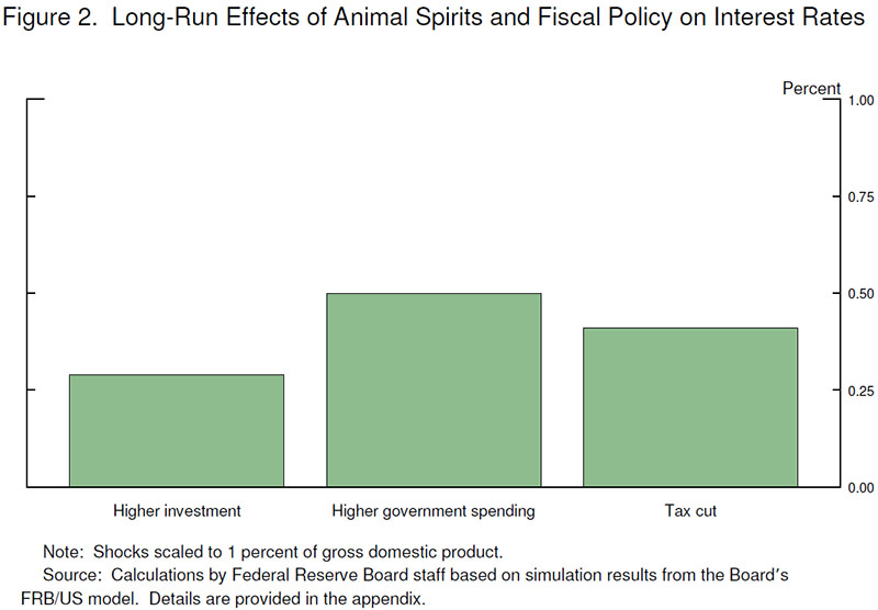 Figure 2: Long-run effects of animal spirits and fiscal policy on interest rates