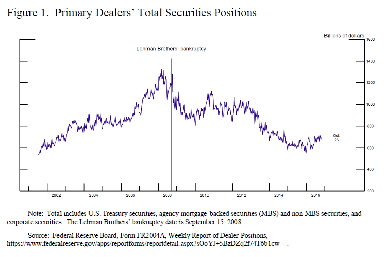Market participants have cited a decline in dealers' inventories as a possible source of decreased liquidity. Figure 1 shows that primary dealers' inventories of fixed-income securities, which are predominantly used for market making, declined sharply after the Lehman Brothers failure, from about $1.3 trillion to about $800 billion, and have since fallen further to about $700 billion. The recent decline might be due in part to regulations, such as the Volcker rule and the Supplementary Leverage Ratio, aimed at making the financial system safer and sounder, as well as to changes firms may have made on their own, perhaps in reaction to the experience of the financial crisis. Regardless of the causes of the change, market participants have expressed a concern that the decline in inventories reflects in part a reduced willingness or capacity of the primary dealers to make markets--which may in turn lead to lower liquidity. However, whether markets are in fact less liquid depends on both the degree to which the decrease in primary dealers' inventories affects their willingness to provide liquidity and the extent to which nonbank firms such as hedge funds and insurance companies fill any lost market-making capacity.4