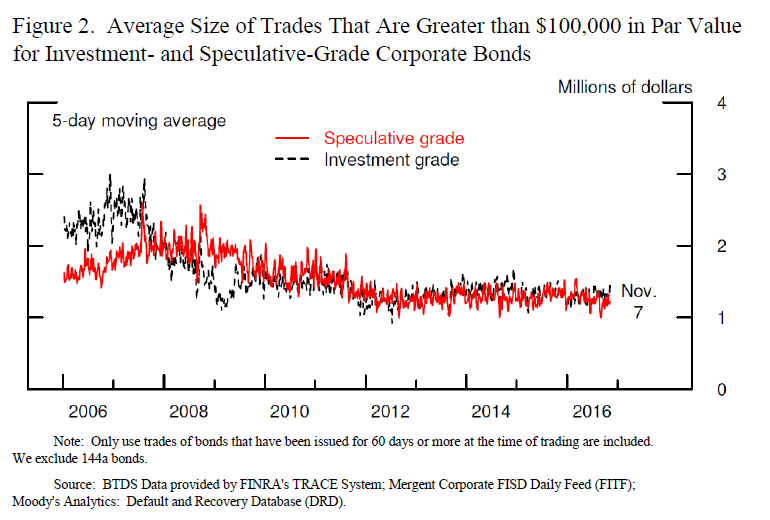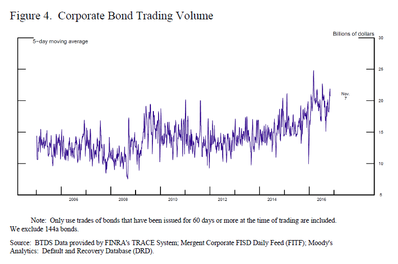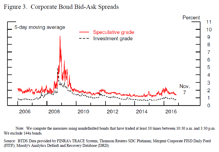 Market participants further express concern about the potential for market liquidity to become less resilient during times of stress, when it is needed the most. However, evidence on this front is difficult to gather. Some argue that market liquidity is resilient because financial markets appear to have functioned fairly well during recent episodes of high market volatility, such as following the Brexit vote or earlier this year, when oil prices were low and stock market volatility was high. Others argue that it is not. According to a recent study, the cost of trading distressed corporate bonds appears to be higher now than in the recent past.5 Specifically, the authors find that, before the crisis, the cost of a $1 million bond transaction increased about 0.7 percent following a downgrade, but--after the Volcker rule--the cost following a downgrade rose 2.4 percent. This analysis, however, is limited to episodes of distressed borrowers rather than a systemwide stress.