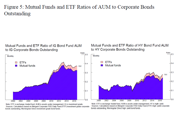 i. Note: Update December 21, 2016: The original version of this speech, referring to figure 5, stated that “In addition, mutual funds that offer daily redemption rights hold a greater share of bonds than investors who buy and hold. As shown in figure 5, the share of investment-grade and high-yield corporate bonds held at mutual funds (the solid blue area) has hovered around 25 to 30 percent in recent years, up from about 15 percent before the crisis.” The figure shows assets under management by corporate bond mutual funds, not such funds’ holdings of corporate bonds, relative to outstanding corporate bonds. The text has been revised to correctly describe the figure. Return to text