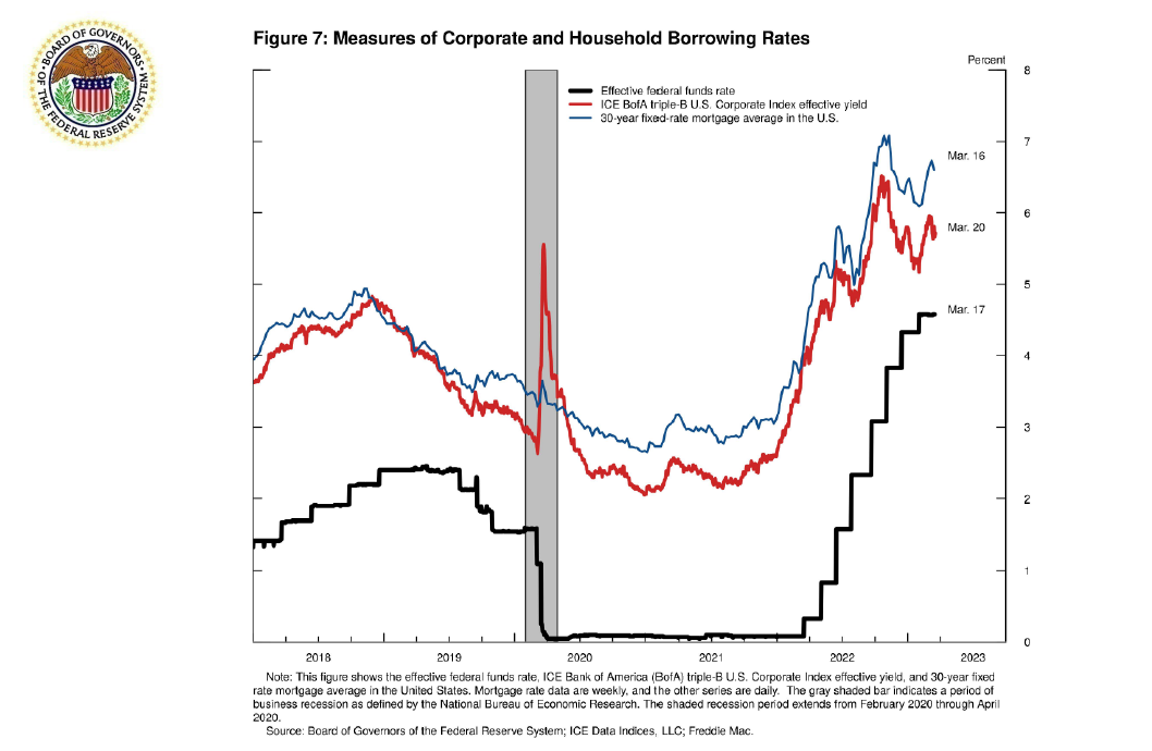 Figure 7 illustrates how long-term interest rates, which are widely viewed as important for businesses' and households' economic decisions, move in anticipation of changes in the federal funds rate. The red line is the average 10-year triple-B corporate bond rate. It is a measure of corporate borrowing costs. The blue line is the average 30-year mortgage rate. It is a measure of household borrowing costs. Notice that both measures increased in early 2022 in response to Fed communications and in anticipation of increases in the effective federal funds rate, the black line. Higher long-term interest rates increase the cost of borrowing money for households and businesses. Therefore, high interest rates raise the incentive to save, which in turn dampens consumer spending on interest rate-sensitive expenditures, like housing and automobiles, and slows businesses' investment in new equipment. The decrease in spending decreases the overall demand for goods and services in the economy, thereby reducing the demand/supply imbalances we have seen, and, consequently, reduce inflationary pressures. As a result, the inflation rate should fall back toward 2 percent, the FOMC's inflation rate target.