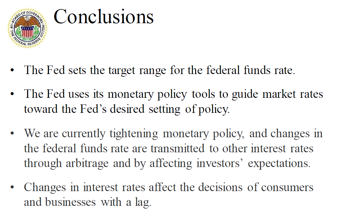 In conclusion, the Fed has a congressional mandate of maximum employment and price stability. The FOMC conducts monetary policy by setting the target range for the federal funds rate. Then, the Fed uses its monetary policy tools to implement the policy, which guides market interest rates toward the Fed's desired setting of policy. The Fed implements monetary policy using administered rates. The interest rate on reserve balances is the Fed's primary tool for adjusting the federal funds rate. The overnight reverse repurchase agreement facility is a supplementary tool that sets a floor for the federal funds rate. The discount rate serves as a ceiling for the federal funds rate. The Fed ensures that the banking system has ample reserves, using open market operations, if needed. Currently, we are tightening monetary policy. Changes in the federal funds rate are transmitted to other interest rates through arbitrage and by affecting investors' expectations. Changes in interest rates affect the decisions of consumers and businesses with a lag. Their decisions ultimately move the economy toward maximum employment and price stability.