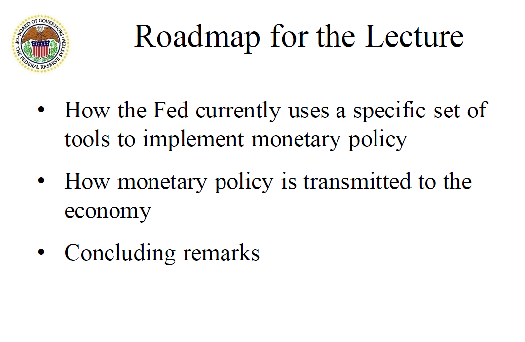 Many discussions of monetary policy simply talk about the Federal Reserve setting the federal funds rate to promote our goals of maximum employment and price stability, without giving attention to the specific actions we take to put the federal funds rate where we want it—that is, to the way we implement monetary policy. And even in economics classes that cover this topic, the teaching materials have not always caught up with the fact that we have purposely changed our implementation framework over the past decade.1 My colleagues at the Fed are working with educators to close the curriculum gap, and I hope this lecture will further help this endeavor.2