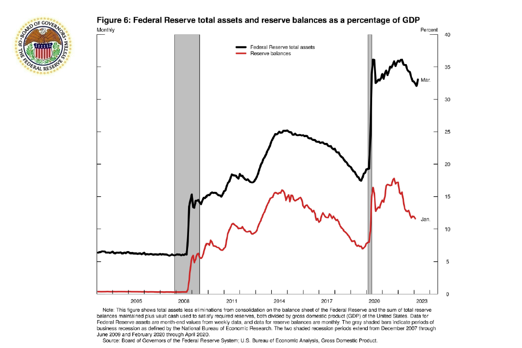 The Fed's balance sheet contains a great deal of information about the scale and scope of its open market operations. Figure 6 shows the evolution of the Fed's balance sheet, where the holdings of U.S. Treasury securities, agency mortgage-backed securities (MBS), and other securities are recorded as assets and reserve balances are recorded as liabilities. Both series are divided by gross domestic product because the Fed's balance sheet should naturally increase over time with economic growth. We entered the ample-reserves regime in 2008, during the 2007–09 financial crisis, as the Fed sharply increased its total assets. In 2020, during the COVID-19 pandemic, there was another sharp increase in total assets. In both instances, the Fed reduced its interest rate target near zero and purchased securities, injecting reserves into the banking system. The effect of purchasing securities was to reduce longer-term interest rates to support the economy. The expansion of the Fed's balance sheet is popularly known as quantitative easing (QE). When QE ended, the Fed reinvested any maturing securities it held to maintain the size of the balance sheet. Now, the Fed is fighting inflation by raising its interest rate target range and is in the process of shrinking the Fed's balance sheet, which is referred to as quantitative tightening (QT), by passively stopping the reinvestment in some maturing Treasury securities and agency mortgage-backed securities (MBS).19