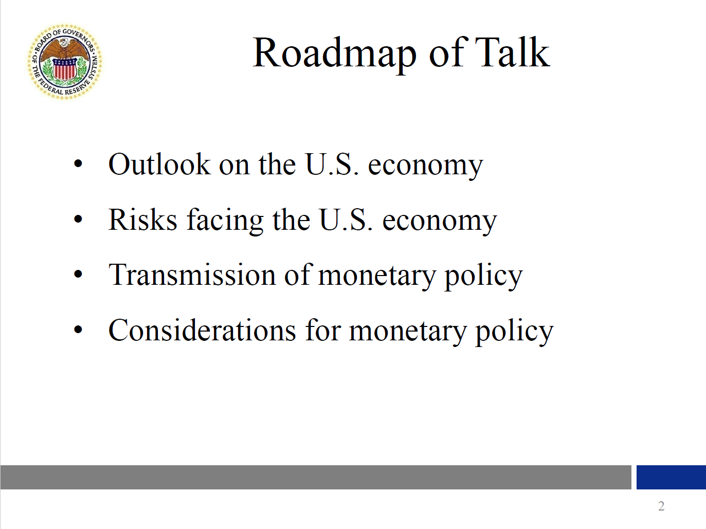 I will take this opportunity to share with you my outlook on the U.S. economy. I will also discuss risks facing the economy. Then, I will turn to the transmission of monetary policy, including some recent evidence on a source of lagged effects of policy. Finally, I will discuss considerations for monetary policy that follow from efforts to manage risks given the lagged effects of monetary policy. These considerations include the need to proceed carefully as the risks of tightening monetary policy too much relative to those of not tightening enough move closer into balance. With that, let me turn to my outlook for the U.S. economy.