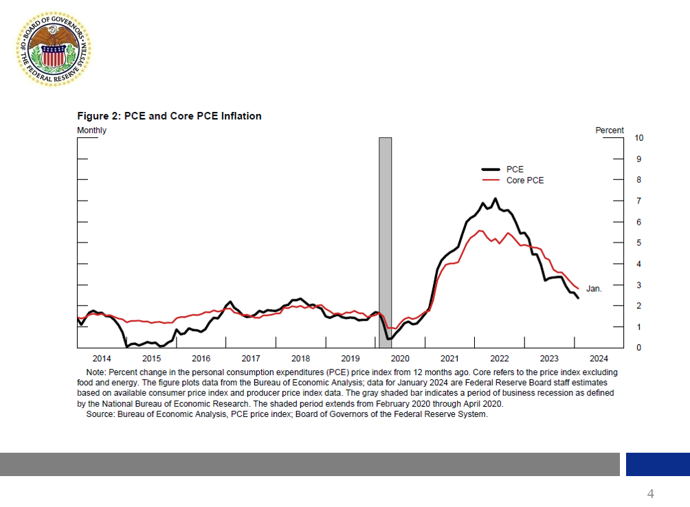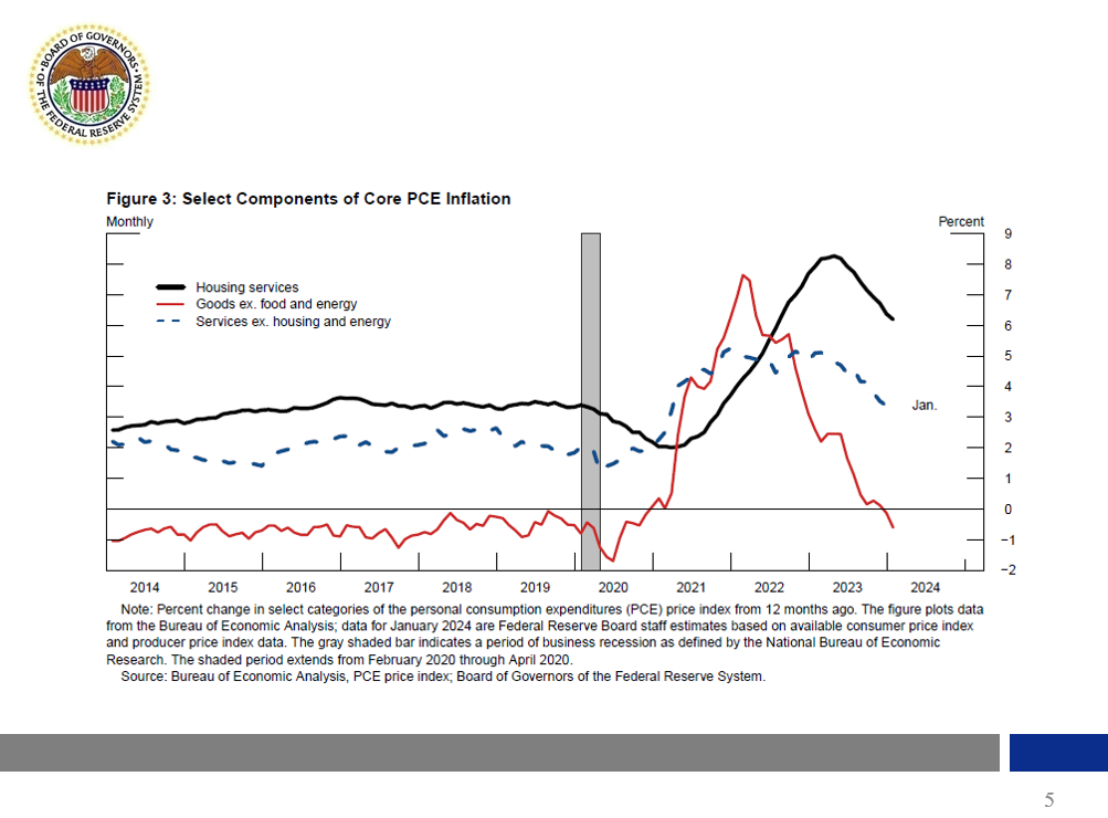 Inflation made clear progress over 2023 toward the Federal Open Market Committee's (FOMC) 2 percent inflation objective. I believe that this progress reflects both the unwinding of pandemic-related supply and demand distortions in the economy as well as restrictive monetary policy, which has cooled strong demand and given the supply side of the economy time to catch up. As shown in figure 2, over the 12 months ended in January, the Federal Reserve's staff estimates that total personal consumption expenditures (PCE) prices rose 2.4 percent, down from 5.5 percent over the preceding 12 months. Core PCE prices, which excludes energy and food prices, rose 2.8 percent, down from 4.9 percent. The figures for January are estimates that incorporate the somewhat larger consumer price index (CPI) increase we saw last month. That disappointing CPI reading highlights that the disinflation process is likely to be bumpy. The January data notwithstanding, the slowing in core inflation has been especially pronounced in recent months, as the 3- and 6-month changes in core PCE prices through January, at 2.5 percent and 2.4 percent, respectively, clearly remain below the 12-month change shown in figure 2. The most striking moderation has been in core goods prices, as shown in figure 3, which have declined outright over the past year. Inflation in core services, both in its housing component and nonhousing services, has also slowed, but not as much. I believe that as the labor market continues to cool, core services price increases will continue to moderate. Of course, I remain attentive to other possibilities.