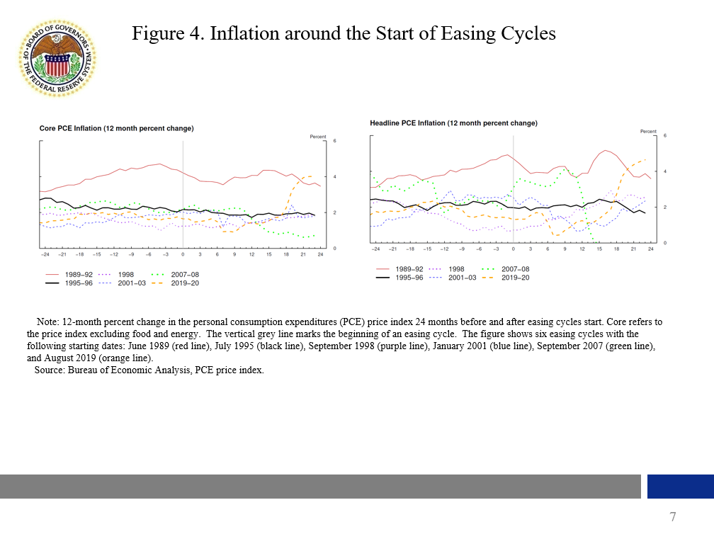 Finally, another observation from reviewing past episodes is that careful easing in the July 1995 easing cycle allowed the FOMC to assess incoming data and other information to make sure that inflation was under control. As I noted earlier, the July 1995 easing cycle is associated with the so-called perfect soft landing. In this particular easing cycle, the FOMC started to ease as it observed a lessening in inflation concerns, left rates unchanged for three meetings as it waited for more information, and then continued to ease.