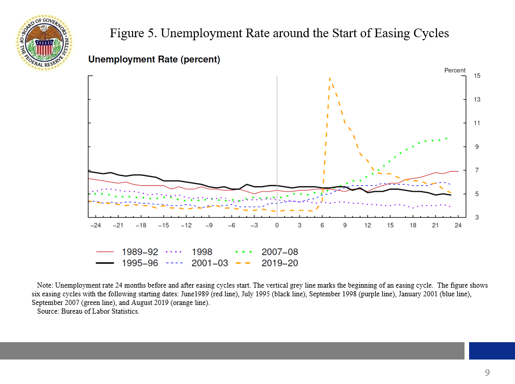 The lesson that policymakers need to remain vigilant and nimble is further illustrated in figure 5, which shows the unemployment rate around the start of each easing cycle. As can be seen from this chart, in some easing cycles—for example, the easing cycles that began in January 2001, shown in blue, and September 2007, shown in green—the unemployment rate ramps up quickly, shortly after the easing cycle began. In both these cases, the economy weakened rapidly.