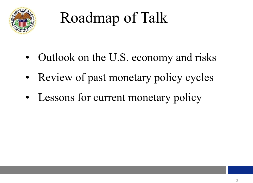 I will take this opportunity to share with you my outlook on the U.S. economy and some upside and downside risks to which I am paying special attention. Also, I will review past monetary policy cycles and discuss what lessons we may learn from them. With that, let me turn to my outlook for the U.S. economy.