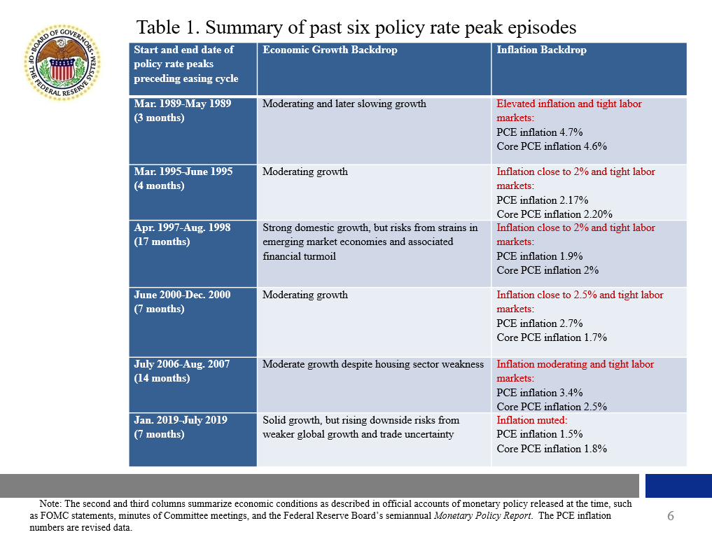 The first column of table 1 lists the dates of the latest six peak-rate episodes preceding easing cycles, defined as a sequence of rate cuts without rate hikes in between. The second and third columns summarize economic conditions as described in official accounts of monetary policy released at the time, such as FOMC statements, minutes of Committee meetings, and the Federal Reserve Board's semiannual Monetary Policy Report. The table also records inflation at the time of the peak rate as measured by the 12-month percent change in headline and core PCE price indexes.2